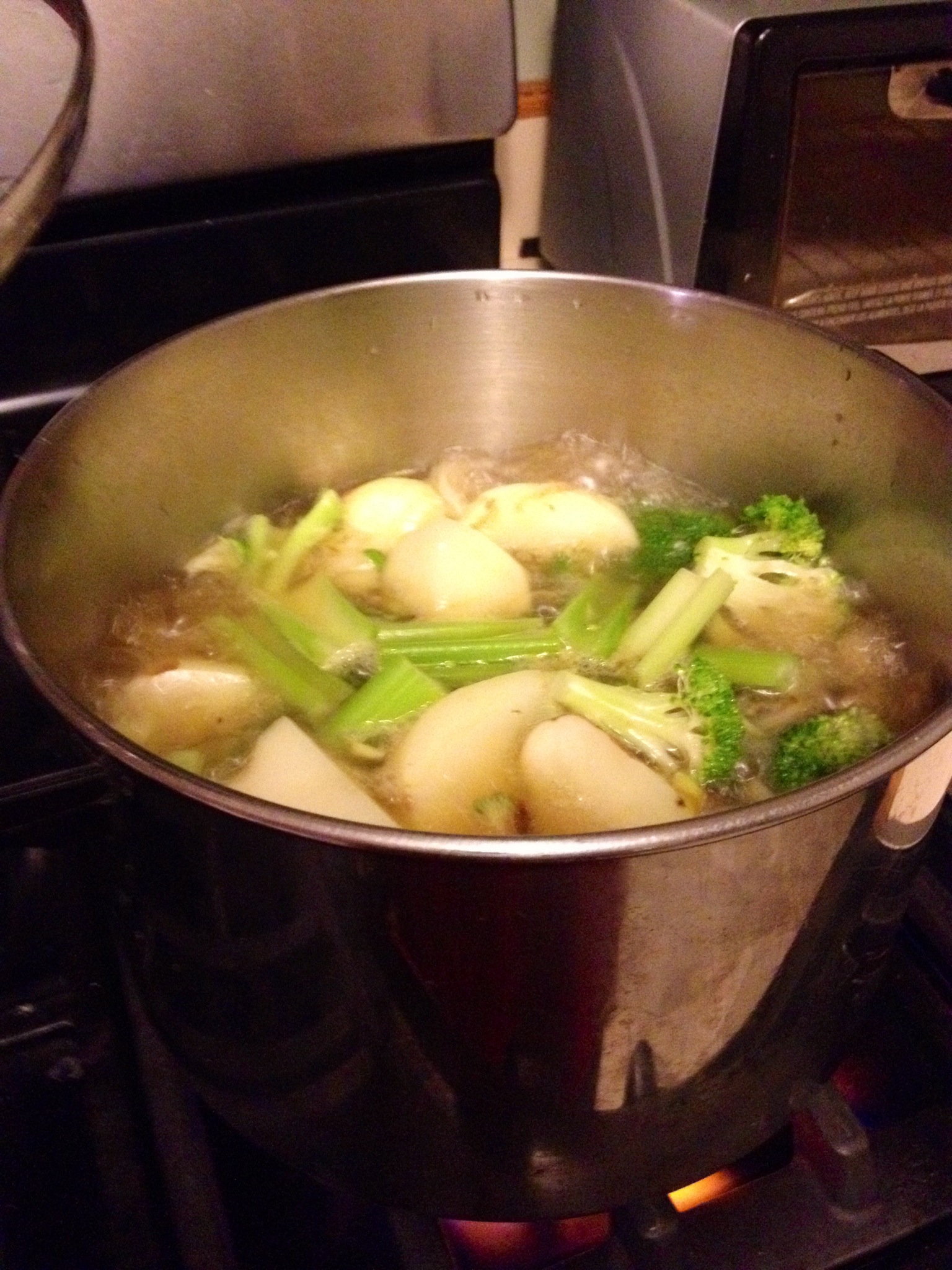 - Chop up the broccoli, potatoes, and celery adding them to the pot