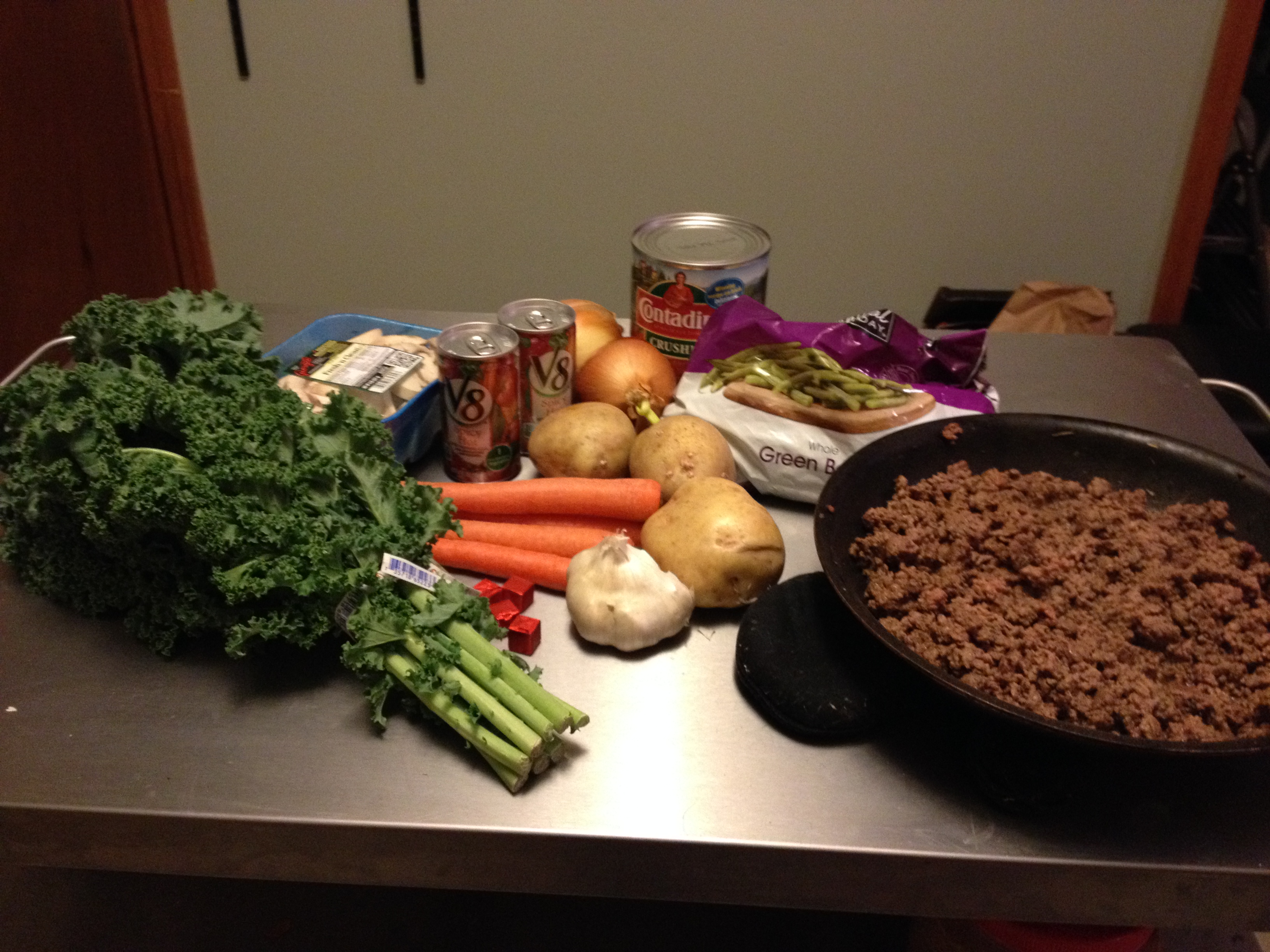 - Place everything in a pot except for ground beef (cook before hand) and kale. Bring to a boil and reduce heat to simmering. Cover and cook for an hour until vegetables are tender.